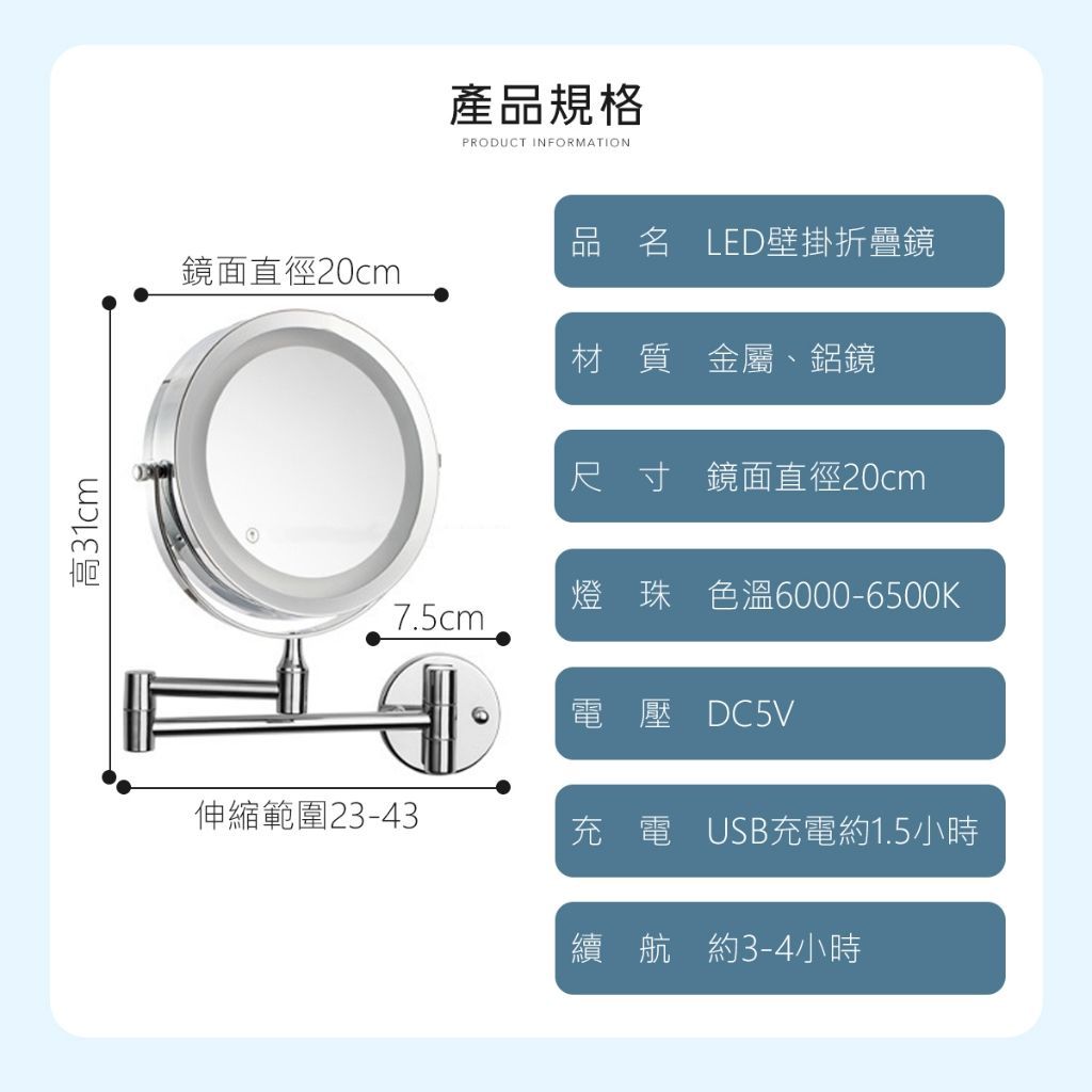 LED雙面補光 三段光 放大化妝鏡 雙面鏡 化妝鏡 補光化妝鏡 摺疊鏡 LED化妝鏡